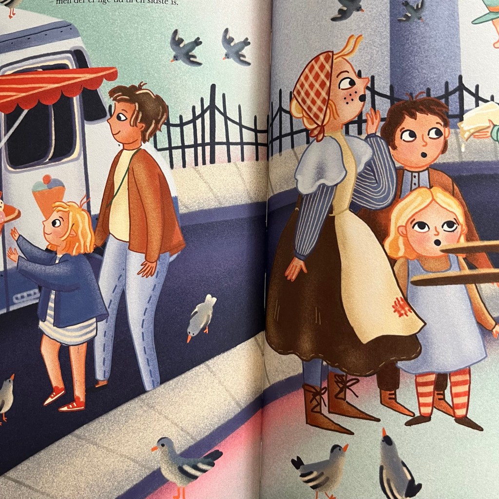 De to parallelle historier er virkelig fint fortalt. Nogle gange er de illustreret side om side, hvilket giver barnet en rigtig god mulighed for at forestille sig både fortid og nutid.